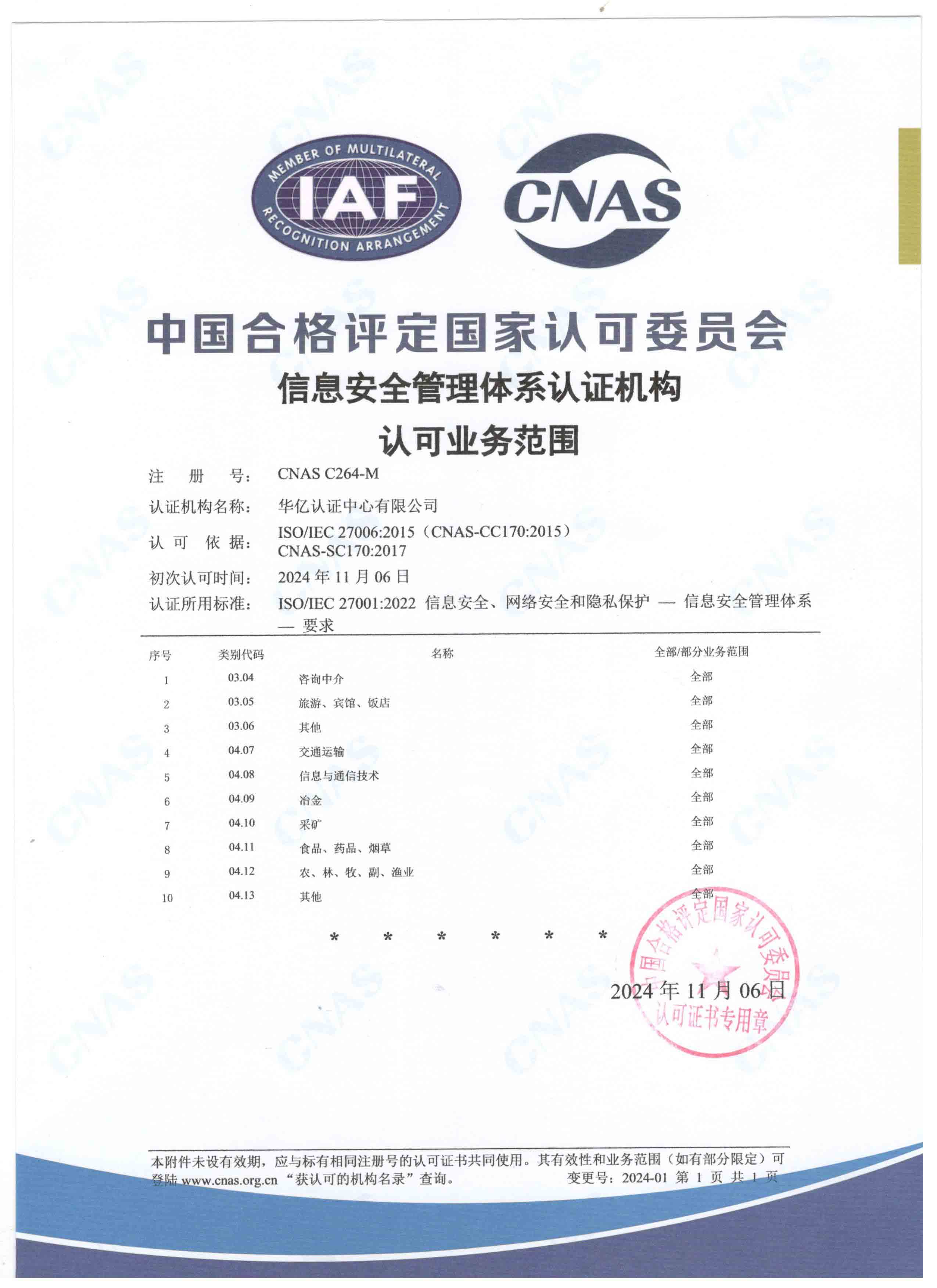 CNAS信息安全管理体系认证机构认可业务范围
